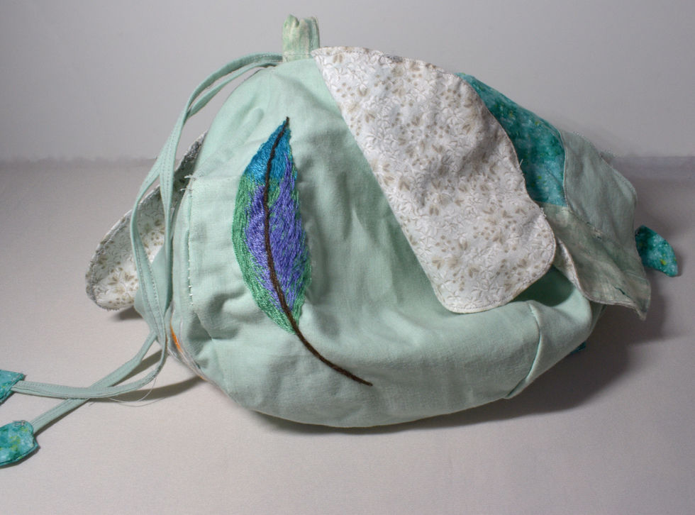 "Fairy Bag", is inspired by Chinese embroidery and lotus flowers. Handmade and hand-embroidered from recycled fabric, this magical creation features hidden treasures beneath its delicate petals.